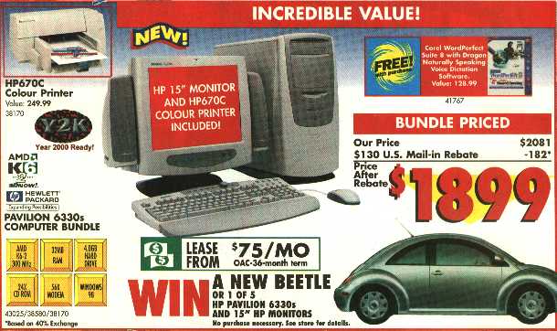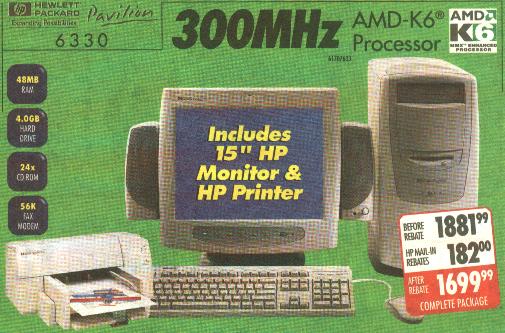 Hewlett Packard Pavilion 6330 with the AMD K6 300 MMX processor, 48Mb, 15" monitor, color printer included for $1699 (98-08-27 Future Shop)
