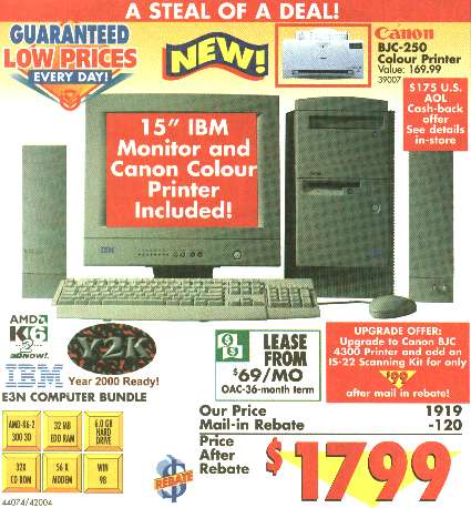 IBM E3N with the AMD K6-2 300 3DNow! processor, 32Mb, 15" monitor, Canon BJ250C color printer included for $1799 (98-08-18 Bureau En Gros)