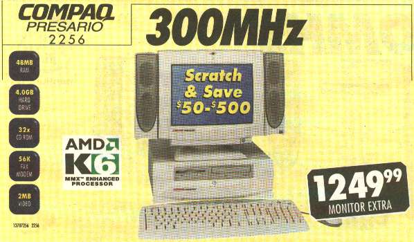 Compaq Presario 2256 with the AMD K6 300 MMX processor, 48Mb, for $1249 (98-08-27 Future Shop)
