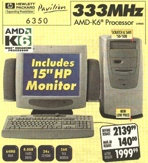 Hewlett Packard Pavilion 6350S with the AMD K6-2 333 3DNow! processor, 64Mb, 15" monitor, for $1999 (98-08-27 Future Shop)