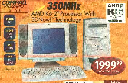 Compaq Presario 5150 with the AMD K6-2 300 3DNow! processor, 128Mb, for $1999 (98-10-09 Future Shop)