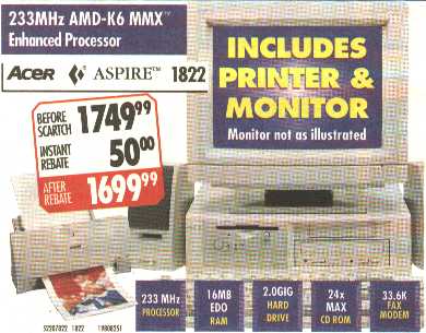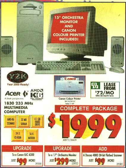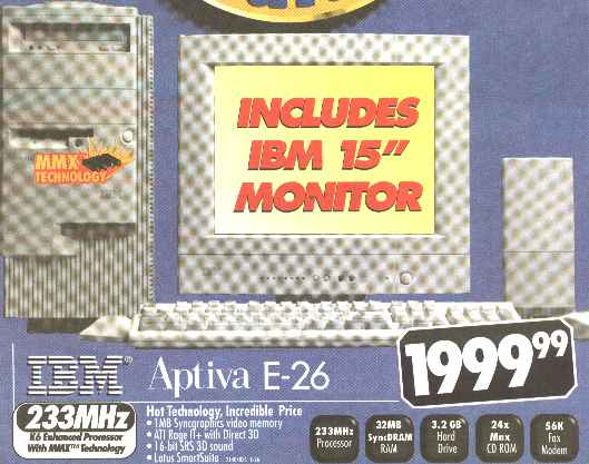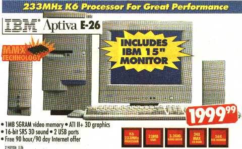 IBM Aptiva E23 with the AMD K6 233 multimedia processor, 15" monitor included, for $1999 (98-03-04 Future Shop)