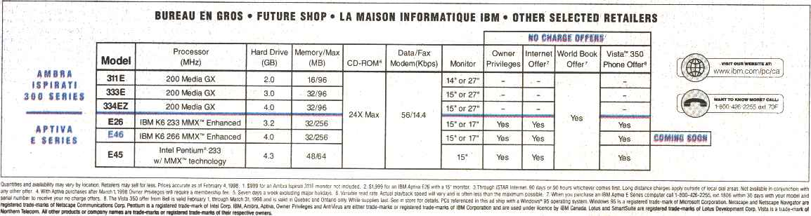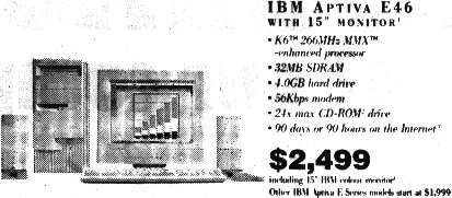 IBM Aptiva E46 with the AMD K6 266 multimedia processor, 32Mb SDRAM, 4.0Gb, 56k, 24x, 15" monitor, for $2499 (98-03-05 La Maison Informatique)