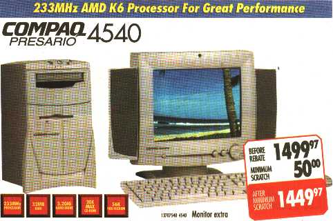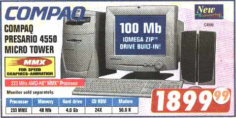 Compaq Presario 4550 with the AMD K6 233 multimedia processor, 100Mb zip drive included for $1899 (98-03-10 Aventure Electronique)