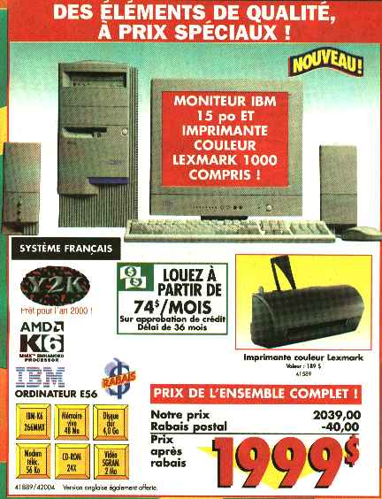 IBM Aptiva E56 with the AMD K6 266 multimedia processor, 48Mb, 15" monitor, color printer included for $1999 (98-05-05 Bureau En Gros)