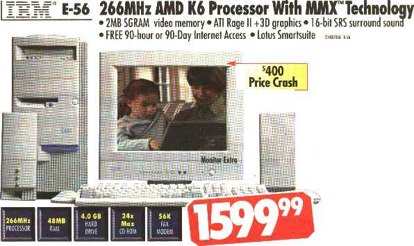 IBM Aptiva E56 with the AMD K6 266 multimedia processor, 48Mb, for $1599 ($400 less than Hewlett Packard 8350 Intel Celeron 266) (98-05-06 Future Shop)