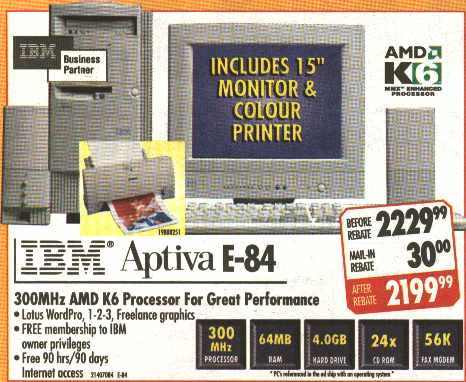 IBM Aptiva E84 with the AMD K6 300 multimedia processor, 64Mb, 15" monitor, color printer included for $2199 (98-05-27 Future Shop)